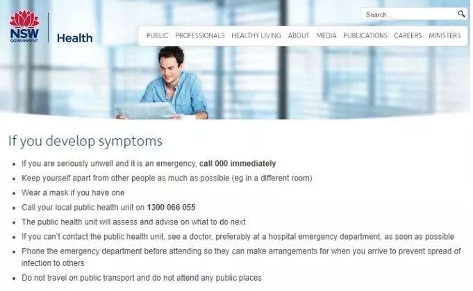 新州卫生部部长Brad Hazzard表示,一旦出现疑似症状,大家应该立刻致电GP或者急救电话000. 去往医院的路上也应该避免使用公共交通工具。