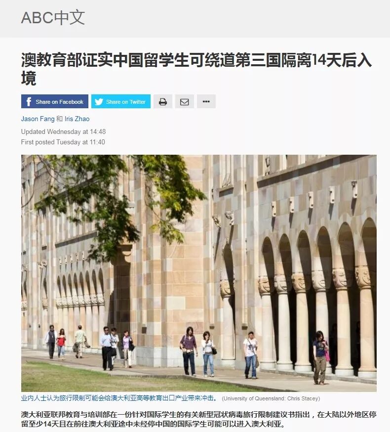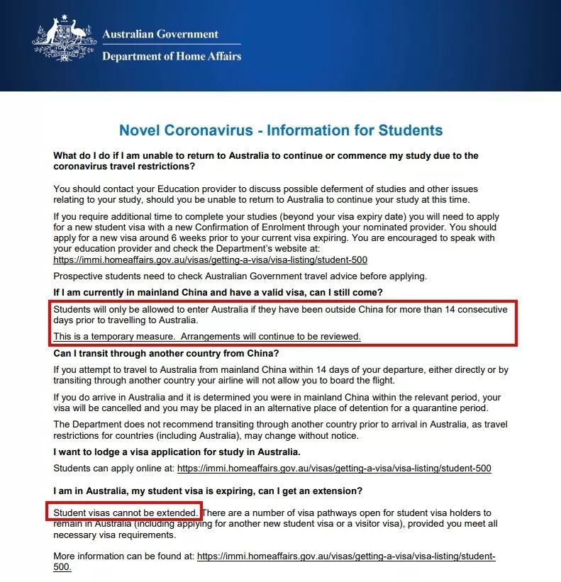 上周五,澳大利亚联邦内政部在最新公布的声明中首次证实,受当前入境禁令影响的留学生离开中国大陆地区后前往第三国停留14天后将可以入境。