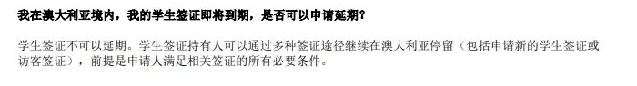 然而,一旦学生延长的学习时间超过其所持学生签证期限,内政部表示学生应申请新的学生签证继续其在澳大利亚的合法居留,学生签证类别不设延期资格。