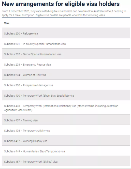 从12月1日起,完全接种COVID-19疫苗的特订签证类别持有者需持三日内PCR阴性证明将可允许进入澳大利亚,无需申请旅行豁免。