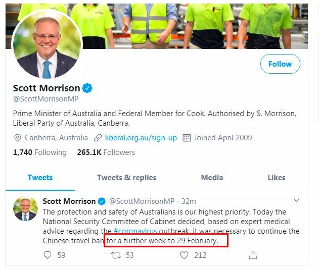 澳洲总理莫里森(Scott Morrison)昨日在自己的官方推特上表示,基于保护澳洲人的安全,以及参考医学专家的建议,内阁国家安全委员会决定将旅游禁令继续延期一周直到2月29号!自发布旅行禁令以来,这已经是澳洲政府第二次延期了!