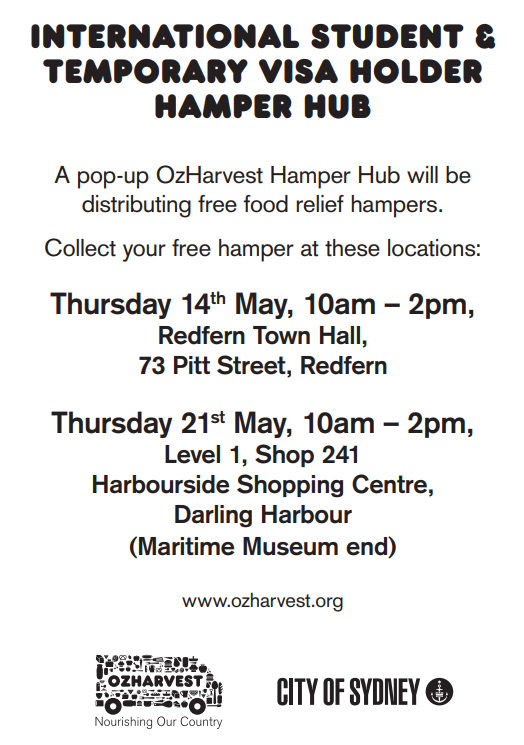 了解到2019冠状病毒大流行為悉尼地区的国际学生及临时签证持有者带来诸多困难,特此,The City of Sydney与OzHarvest和Mirvac合作为国际学生和临时签证持有者提供免费的食物救济篮。