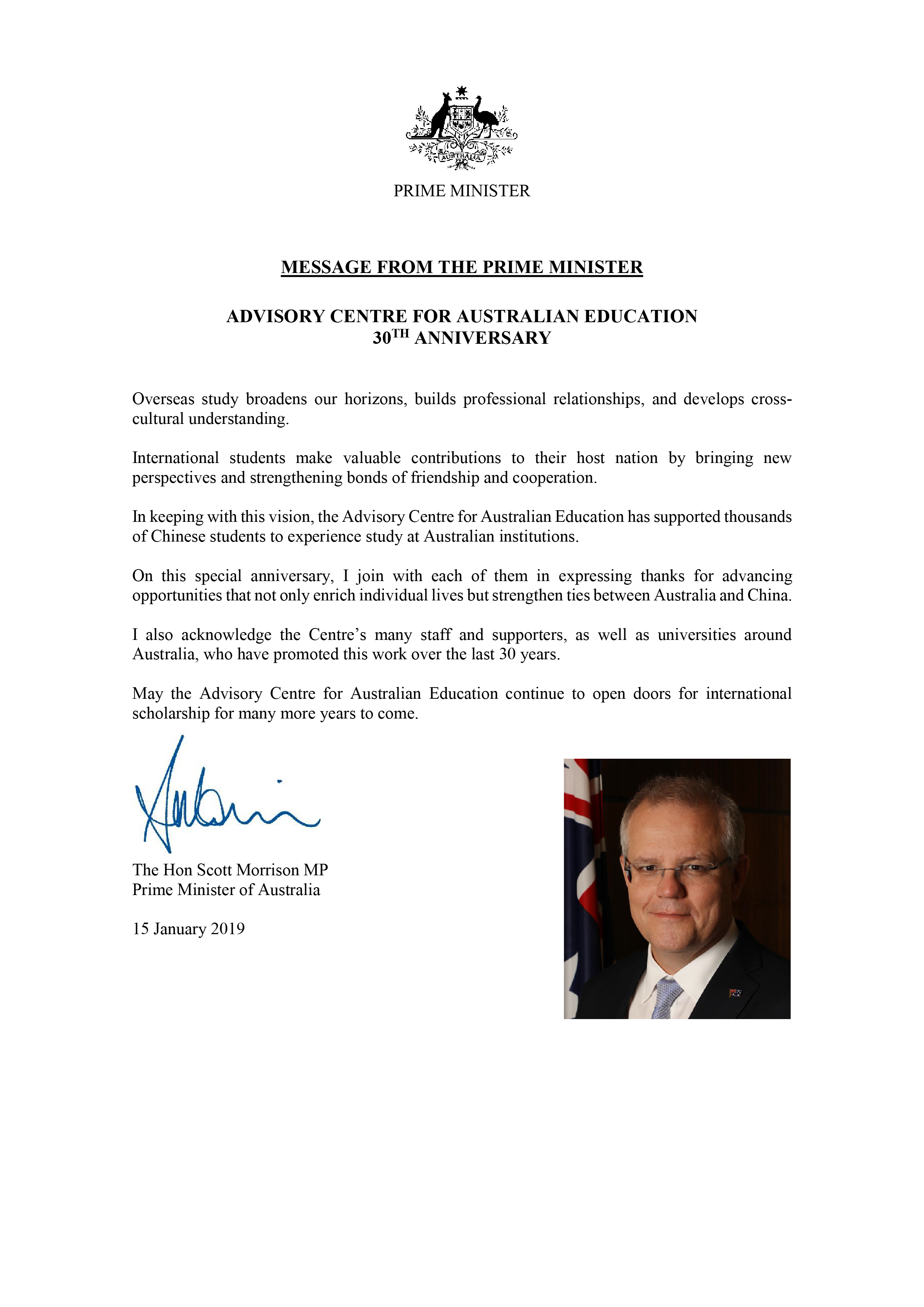 中心成立30周年之际 ,现任总理The Hon Scott Morrison MP代表澳洲政府来函道贺。 信中表示30年以来澳洲留学辅导中心为众多中国学生来澳学习提供了帮助,做出了巨大贡献, 总理也祝愿中心拥有更好的未来。