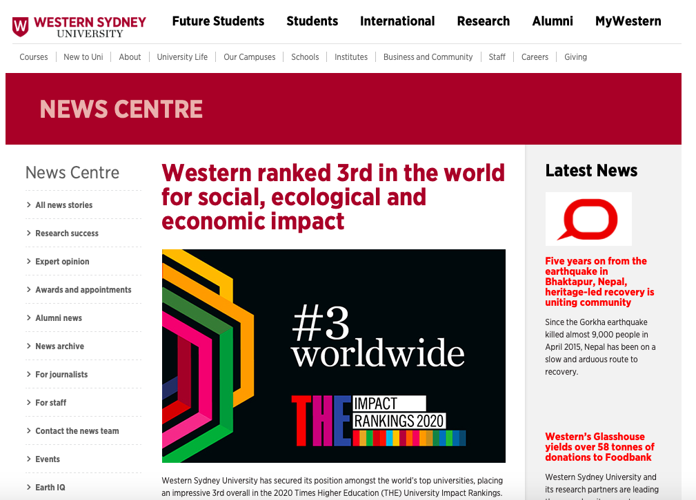 在2020年最新的泰晤士报高等教育(THE)大学影响力排名中, 西悉尼大学跃居全球第三,澳洲第二。在此次评估中,西悉尼大学的表现尤为突出。