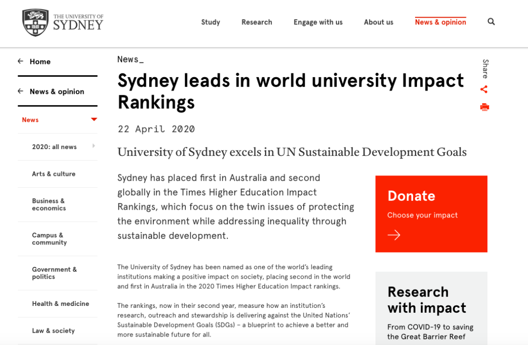 在去年发布的首届世界大学影响力排名中,悉尼大学位列全球第25名。在此次排名中,荣升至全球第2名。